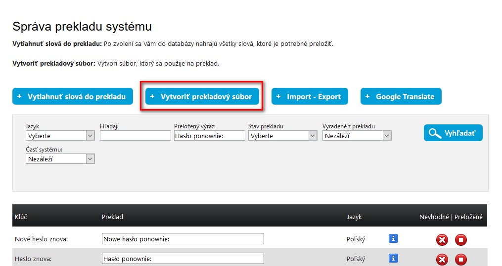 Po tom, jak budete mít upravené všechny texty musíte kliknout na: "Vytvořit překladový soubor" čím aplikujete překlady. Vytvořit překladový soubor netřeba klikat za každým jedním překladem, stačí to kliknout na konci.