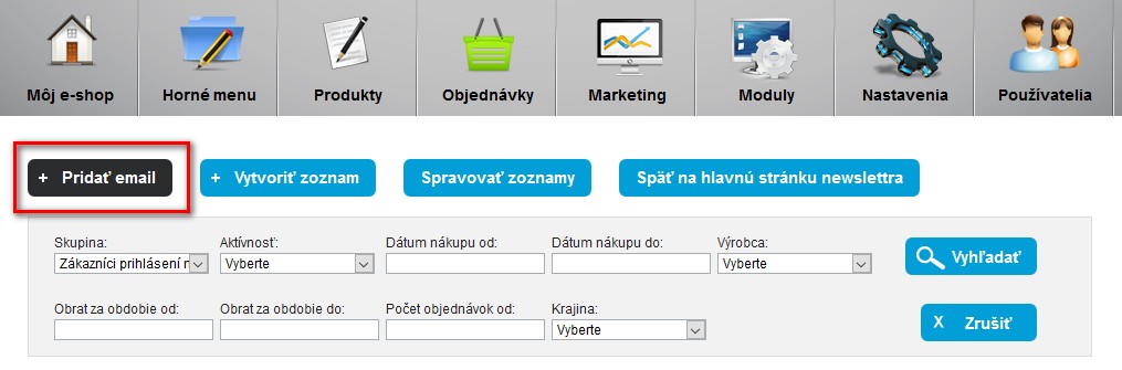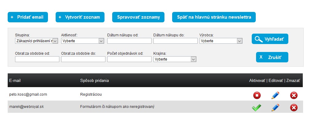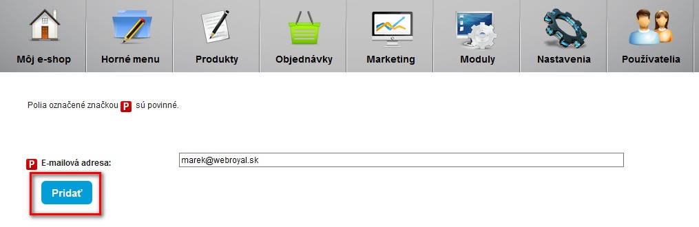Zákazníka také můžete přidat přes uživatelské části na spodku stránky, pokud to však uděláte takhle, tato registrace podléhá ještě zákazníkova scháveniu a to kliknutím na ověřovací linku, kterou systém zašle na zákazníkovi mail. Pokud přidáváte mail přes administraci, tento mail je rovně ověřen.