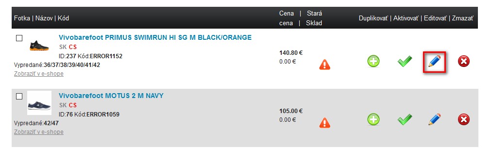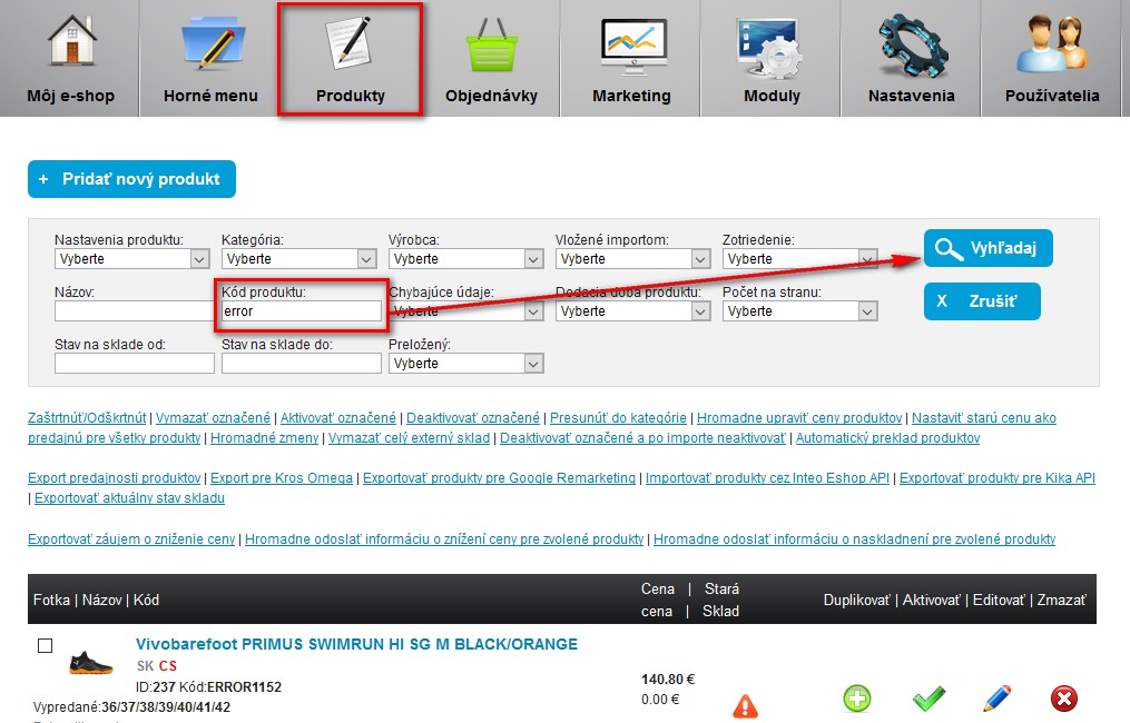 Klikněte na velkou ikonu produkty, čímž se Vám zobrazí seznam produktů. Použijte vyhledávání na kód produktu do kterého zadáte: error a kliknete na vyhledat, čímž získáte produkty s kódem error: