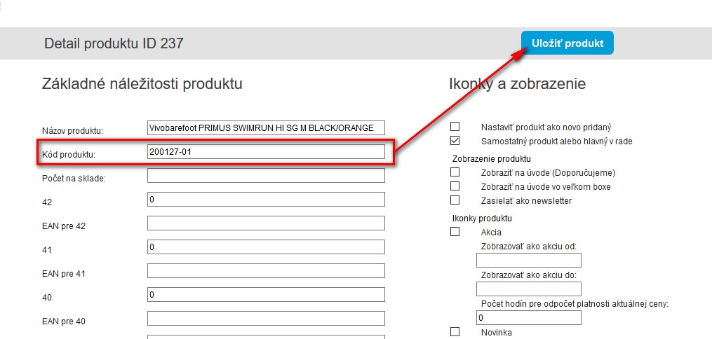 Následně editujte produkt, produkt podle názvu vyhledejte ve vašem MK Soft a zapište namísto kódu produktu "error", kód zadaný v MKsofte a klikněte na uložit.