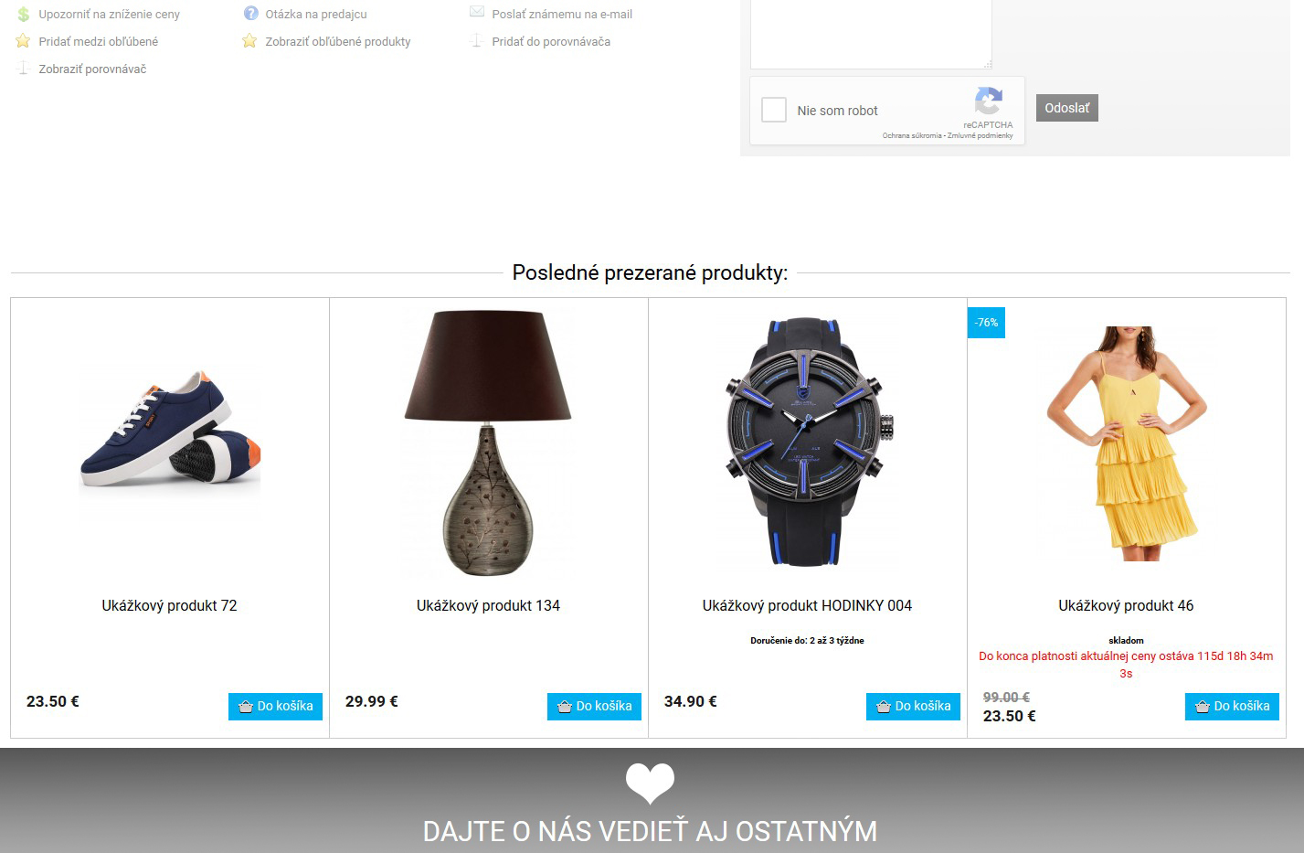 V každém detailu produktu se nachází možnost jeho doporučení známému prostřednictvím e-mailu. Je to výhodné v případě, že uživatel u Vás najde zboží, o kterém ví, že ho někdo z jeho okolí hledá.