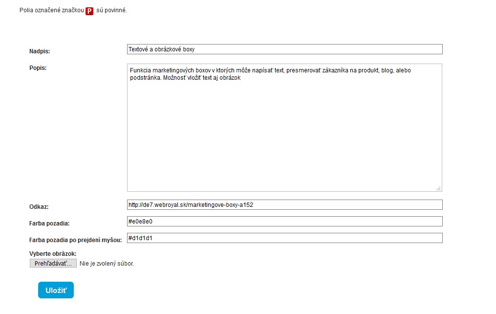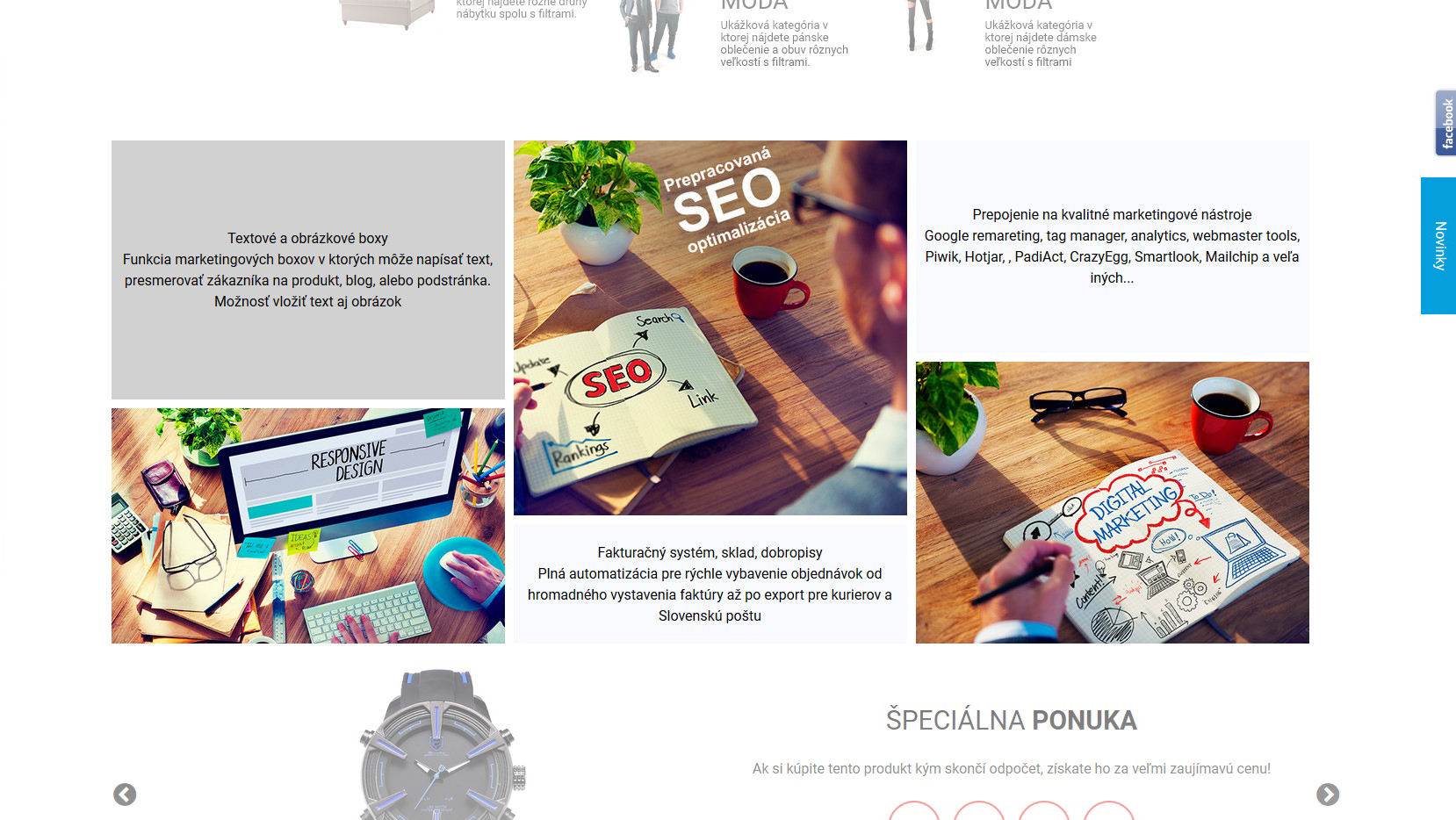 Zobrazují se na úvodní stránce a mohou být poskládány z textů a obrázků.