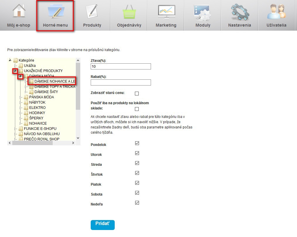 Pro každou kategorii lze nastavit zleva či rabat. Tyto se použijí na všechny v ní zařazeny produkty.