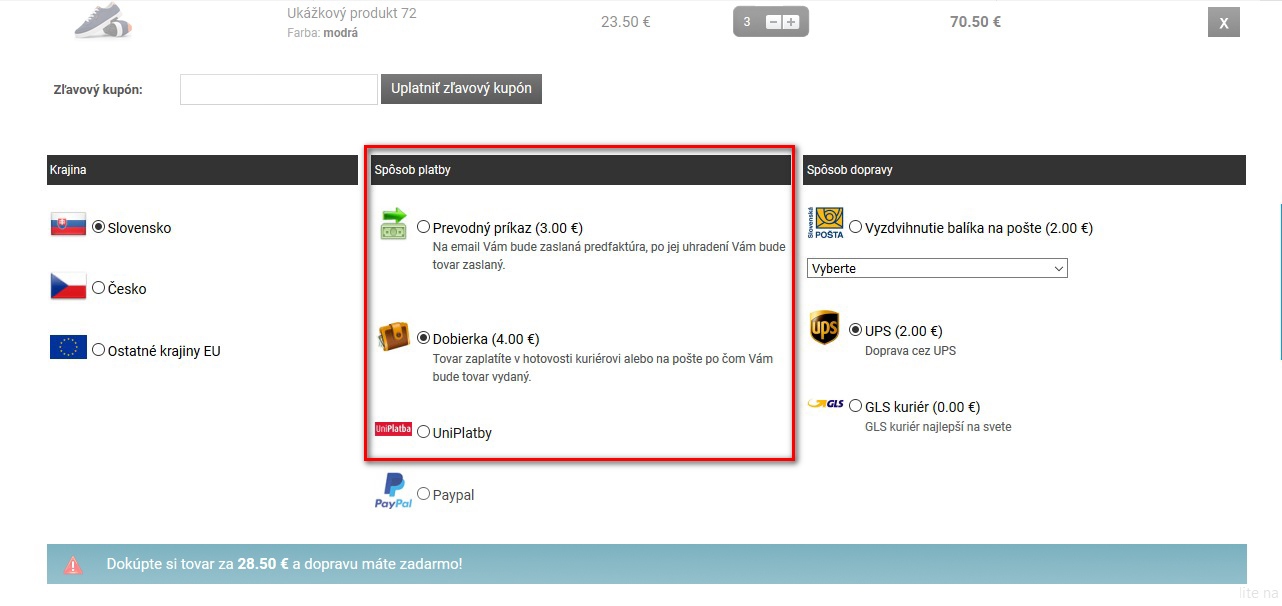 Pro zákazníky motivovat k platbě za zboží převodem a vyhnout se tak dobírkové poplatkům, můžete zpoplatnit i způsob úhrady (např. Dobírka za 1 €).