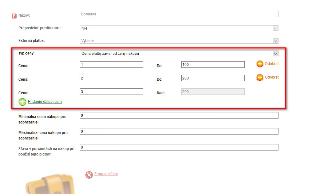 V případě, že zpoplatňovat některou z plateb, můžete určit, zda její cena bude stálá nebo bude záviset na výši nákupu.