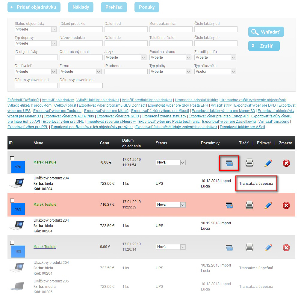 Napojení platebního modulu je zpoplatněno částkou 99 € / modul. Funkční řešení máme hotové pro většinu Slovenská bank, o které obchodníci projevili zájem. Stačí nás kontaktovat a rádi Vám poskytneme informace o možnostech platby pro tu Vaši. I v tomto případě naleznete výsledek platby v detailu objednávky, kde ihned uvidíte, zda proběhla bez problémů.