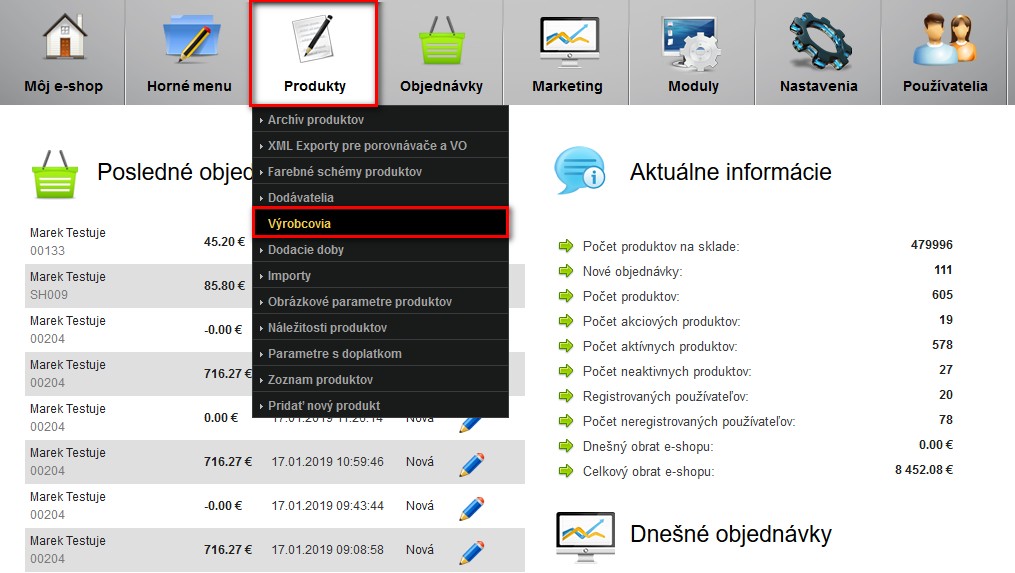 Pod nabídkou "Produkty" zvolte "Výrobci"