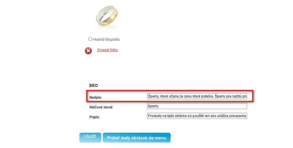 Každé stránce, kategorii, produktu, článku či blogu je možné nastavit titulek, popis či klíčová slova, která jsou velmi důležité. Pokud je však nevyplníte, automaticky se čerpají z názvu či popisu dané položky.