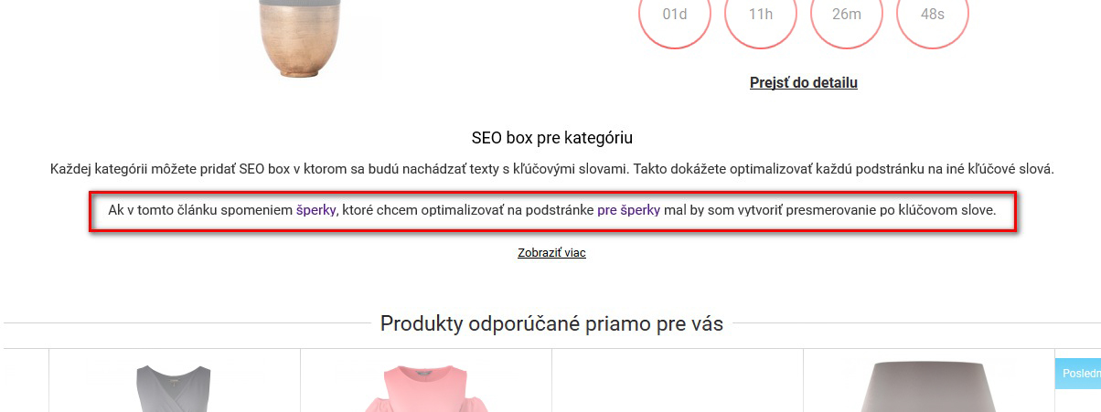 V rámci SEO boxů, které se dají vytvářet pro všechny kategorie přes administraci e-shopu, můžete každé z nich přidat dodatečné texty a obrázky, což Vám dopomůže k lepšímu umístění.