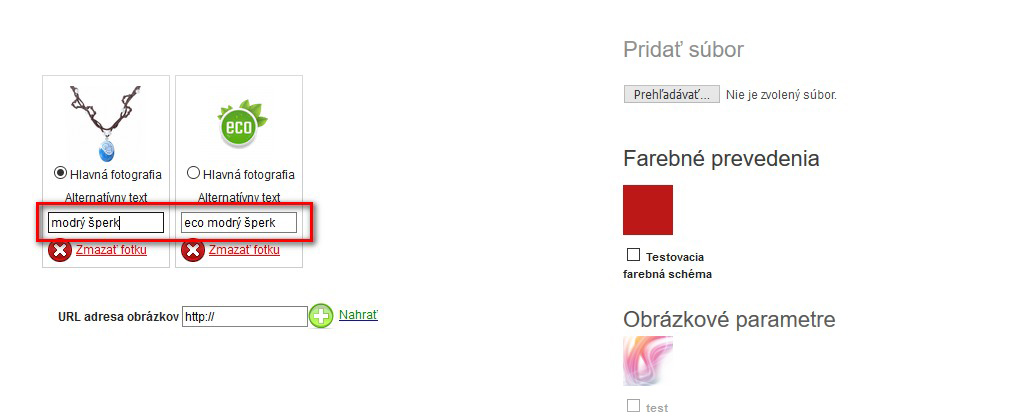 V rámci detailu produktu máte možnost nahrát fotky, které by měly být pojmenovány podle klíčových slov. My jejich názvy zachováme a nabídneme Vám možnost vyplnit pro vyhledávače velmi oblíbený alternativní text.