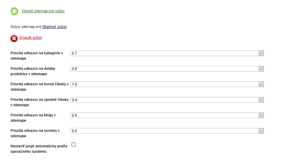 Systém má vytvořený vlastní sitemap generátor, pomocí kterého víte jedním poklepáním myši vygenerovat aktuální sitemap.xml soubor. Vyhledávač se díky němu lépe orientuje na Vašem e-shopu. Můžete nastavit prioritu informací tak, aby věděl lépe odlišit podstatné odkazy od těch méně podstatných.