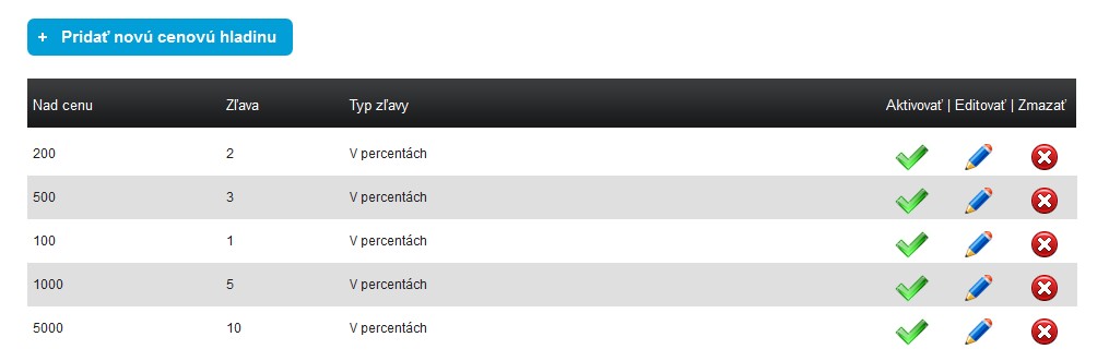 Slouží jako motivace zákazníka k většímu nákupu. Umíte si nastavit libovolný počet cenových hladin typu "Nakup nad 100 € a získáš 3% slevu", "Nakup nad 500 € a získáš až 10% slevu.".
