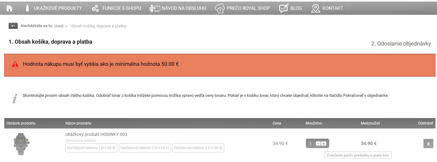 Mnoho obchodníků, kteří prodávají i levné položky, využívá minimální cenu objednávky. V případě jejího zadání zákazník nemůže dokončit objednávku s cenou pod touto hranicí a systém ho vyzve k dokoupení dalšího zboží.
