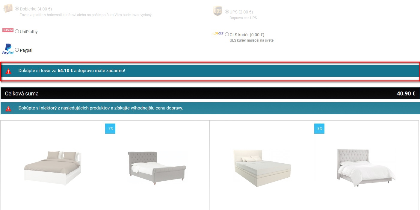 Tato funkce košíku motivuje zákazníky po zvolení platby a dopravy k dokoupení zboží ve zbytkové hodnotě pro získání bezplatného doručení. Slovenský zákazník rád ušetří, proto může být i velmi účinná.